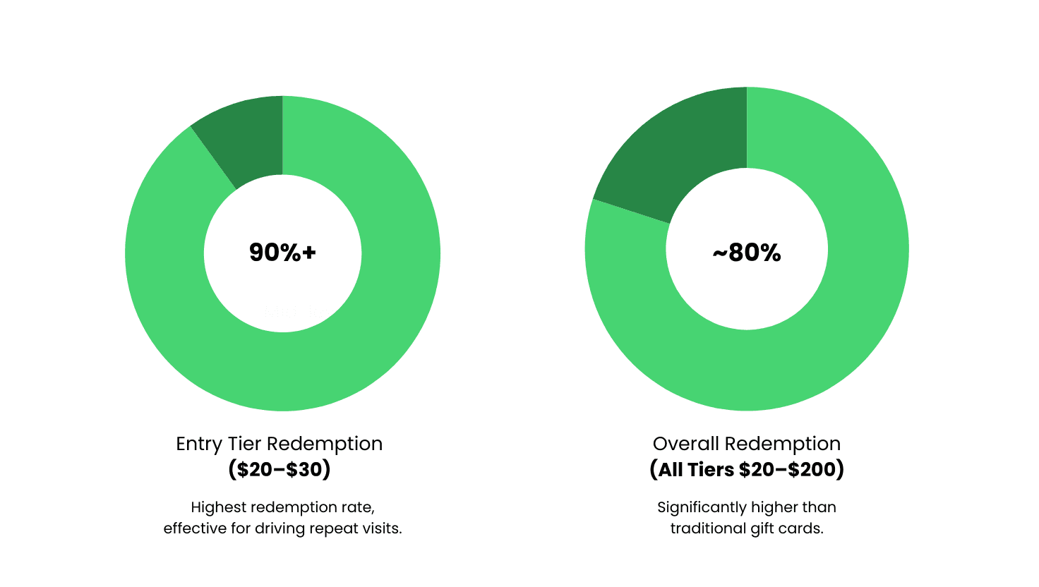 Higher tiers, where customers commit $100 to $150 upfront, also maintain strong redemption rates. Customers purchasing at this level demonstrate clear intent to return and represent high-value segments within the customer base.